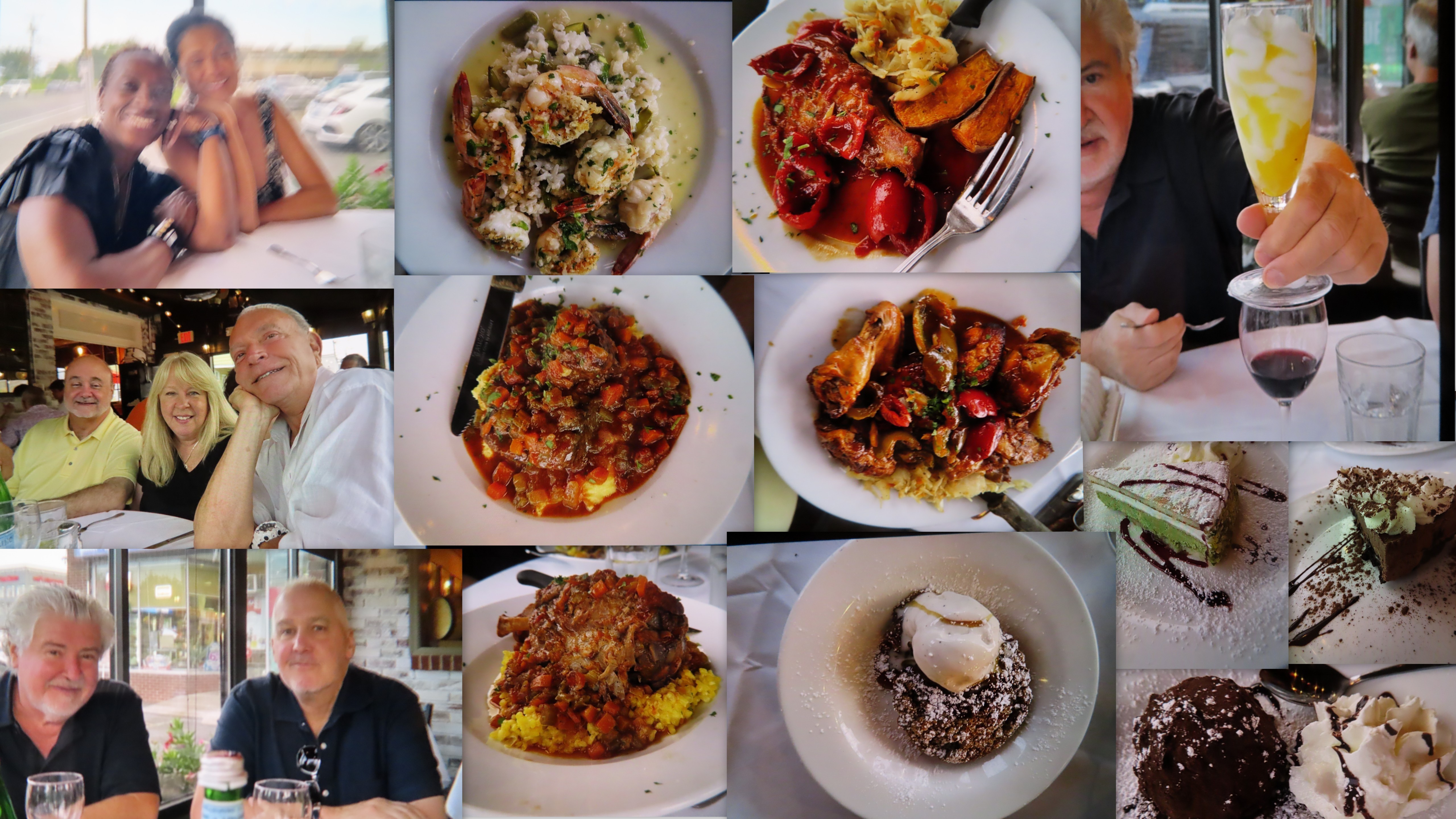 …………….Last evening I went out to dinner with friends….some old friends and some new…..We went to a wonderful Italian restaurant called “Cafe Silvium”……From the top left, that’s Alicia and Tanya [sorry about the blurred picture!]. Alicia delivered 15 babies this month! and on Monday she has appointments to deliver 3 MORE, and that just her appointments!….Tanya is a retired art teacher and an artist…Two of her students, from years ago, were in the restaurant and wanted to say HELLO! Tanya was very pleased……Below that picture is Vinnie, his wife Cathy and me. Vinnie is a lawyer, and Cathy sells real estate…..They know where I live very well, and we have mutual friends….small world…..Below us is Paul [Tanya’s husband] and Mike [Alicia’s husband]…..They are both incredible artists, and share a loft to do their work…..and Paul MAKES GUITARS!!!….Paul is also Vinnie’s first cousin….”La Famiglia”……. We had an assortment of dishes….calamari grilled….fish salad….chicken scarpariello,….osso buco….shrimp with asparagus risotto…..scallops….and pork chop scarpariello….It was all delicious!……For desert we had profiterol…..apple tart with ice cream….nutella cheesecake [Alicia said my chocolate cheesecake was MUCH BETTER!]……..and Paul had a Limoncello parfait!…………….GOOD FOOD……..FUN CONVERSATION…….WONDERFUL FRIENDS!
