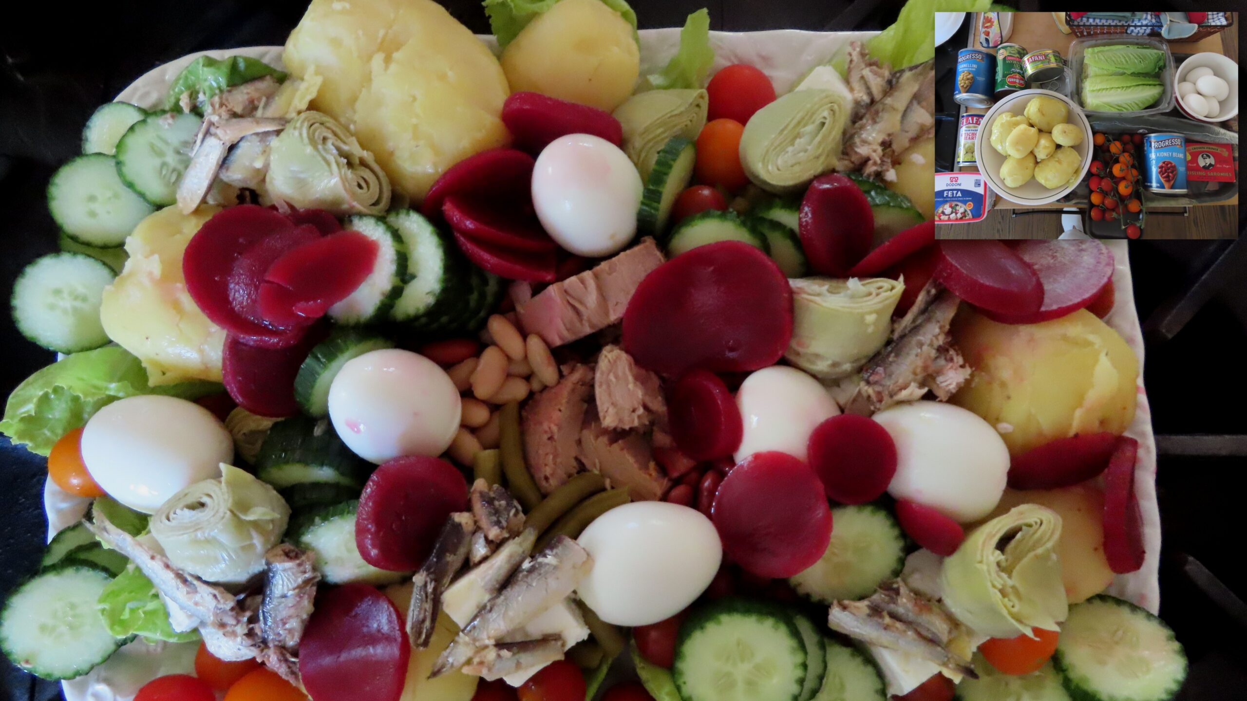 …………..It’s that time of year!…….When it’s HOT, HAZY and HUMID…..known as the “SUMMER DOLDRUMS”…..When we are having this kind of a weather spell….I prefer not to cook!……so I prepare a HUGE SUMMER SALAD…..There’s no receipt for this….you just choose things you like…..I start with a bed of my favorite lettuce for this type of salad…ROMAINE….I think it holds up better after a few days in the refrigerator and doesn’t wilt…..In the center I put my Sclafani Italian tuna, and then my cut string beans, my red beans, and my cannellini white beans….then I add my grape tomatoes, sliced English cucumbers….boiled eggs….boiled and pealed white potatoes…..artichoke hearts….beets….Feta cheese….and anchovies…..I’ll either make a lemon dressing with white balsamic vinegar and olive oil, or my Dijon mustard dressing with olive oil, and also white balsamic vinegar…….Guests love this salad for lunch or dinner…..and I can have several meals out of it……A cool refreshing repass for these hot summer days with an ice cold glass of white or rose wine!