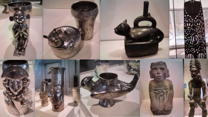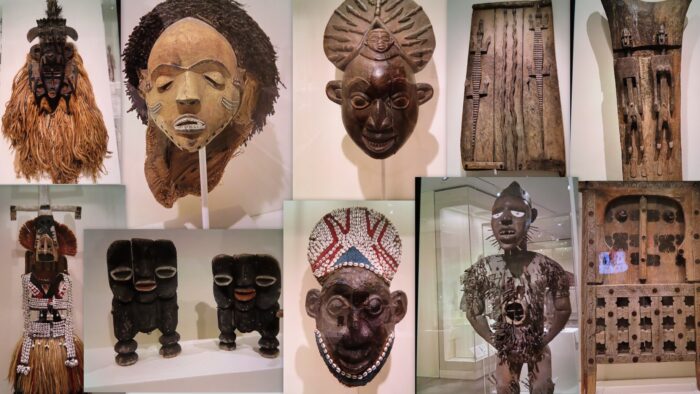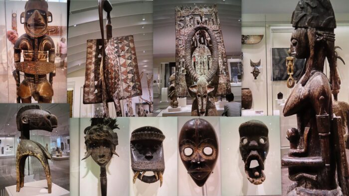 ………………Chapter #6……….There were so many objects to feast your eyes upon. The incredible masks, and the costume at lower left were just incredible….The double doors, second photo in from the upper right, had crocodiles and snakes carved into them…..and the cabinet lower right, was fabulous……The poor guy with the sad white eyes and all of the nails sticking out of him reminded me of VOODOO DOLLS!…The little odd twins are adorable, and reminded me of cartoon characters…..wonder what they were for….maybe a child’s dolls?