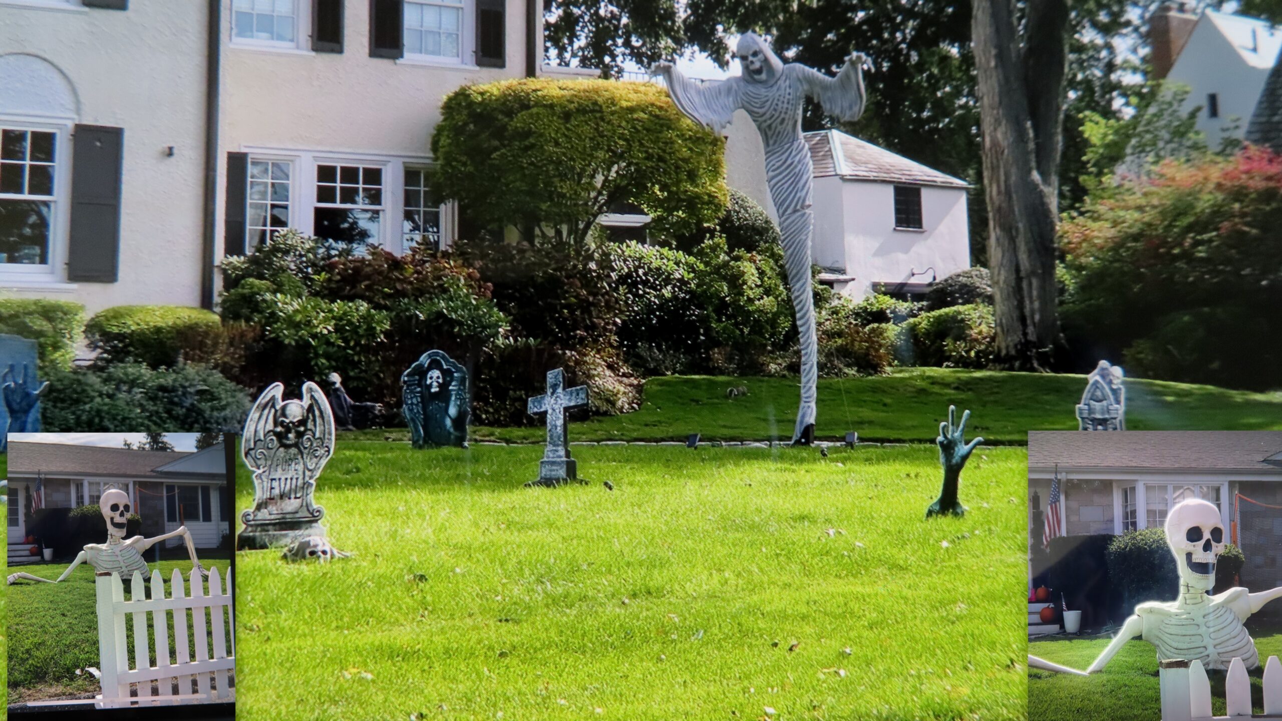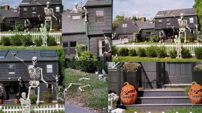 ……………..I was listening to a local TV station, and one of the stories they were talking about was how thieves were going on peoples property at night and STEALING the GIANT SKELETONS, GHOSTS and WITCHES off from their front lawns! One of these thieves was caught on a house camera going on the lawn, taking down the huge skeleton and putting it in the back of his truck with half of the skeleton hanging out! After hearing this story I noticed after driving around the neighborhood that I only saw three of these huge creatures in front of peoples homes…..There used to be many!!….and they aren’t inexpensive!….It has become very common to hear stories about peoples packages being stolen from their front doors….but…..this is a NEW LOW!…..What is the matter with people thinking it’s OK to steal other peoples decorations!! I doubt that the police were able to get the trucks license plate number due to the skeleton hanging off the back!……I used to do a pretty elaborate display at my front door with two bales of hay, tall corn stalks on the poles and many pumpkins on the stairs and sitting of the hay bales….Instead of carving them I used to paint faces on them with black paint….However, before Halloween even arrived the squirrels ate right through the pumpkins and destroyed them leaving a mess….Forget about them making it for Thanksgiving……By then they were in the garbage…..I even tried spraying the pumpkins with acrylic lacquer, but that didn’t stop them…They ate right through it!….I decided since no one can see my house from the road, and the only people to see my decorations were the mailmen and delivery men…and me…and I was tired of the mess the squirrels left behind….I just wouldn’t do it anymore….Now, I just decorate the inside….which my guests appreciate!…..People are just getting worse and worse!….No self respect or dignity!!