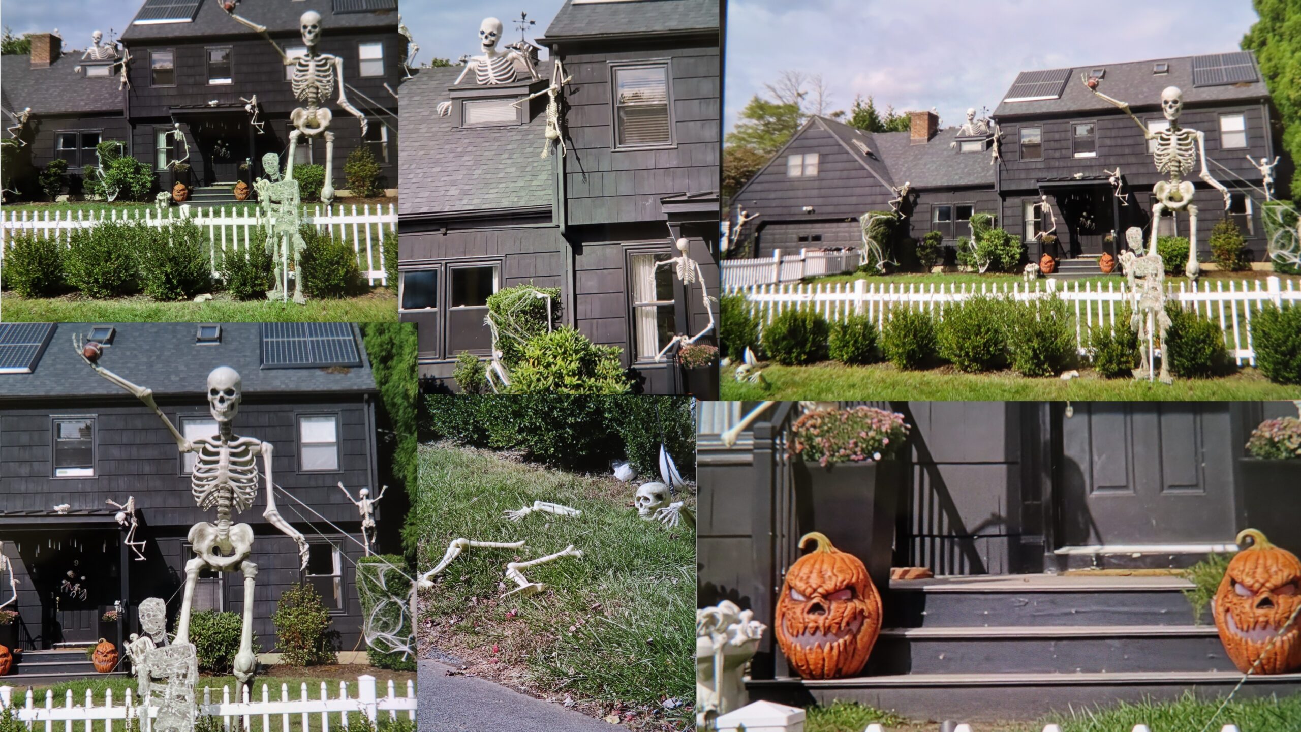 ………………..One of my neighbors is into the more MACABRE, SPOOKY style of decorating……The other day, on my walk, I spoke to the woman who owns the house. She was walking her baby in a stroller on this beautiful, crisp, sunny day. I told her I loved the way she decorated her house!……She replied….”oh no, this isn’t me….it’s ALL MY HUSBAND!….He does it all!!”….I said “your husband must have some sense of humor….right up my alley”…..she yes “yes he does,”, with a big smile on her face. My photos don’t even show all of it. There’s a giant white spider on top of the mail box, and other skeletons crawling all over the house….on the roof and crawling up the sides, plus other creepy things crawling about…..For Christmas he leaves up all of the skeletons……and puts SANTA HATS on all of them!………My kinda guy!